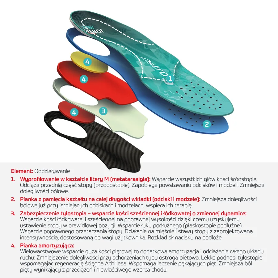 - Trójpoziomowe działanie: przód – śródstopie – pięta